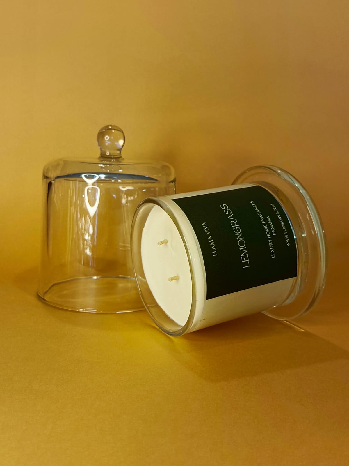 Envase de cristal con tapa en forma de domo. Con dos mechas, perfecta para espacios amplios.